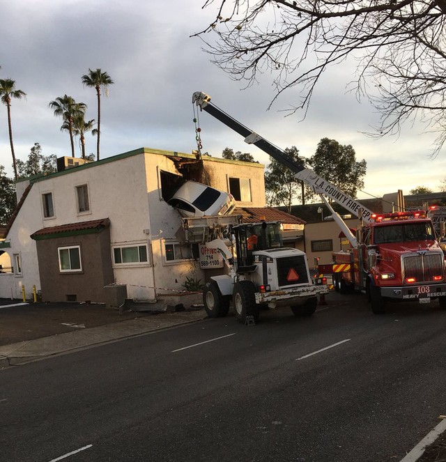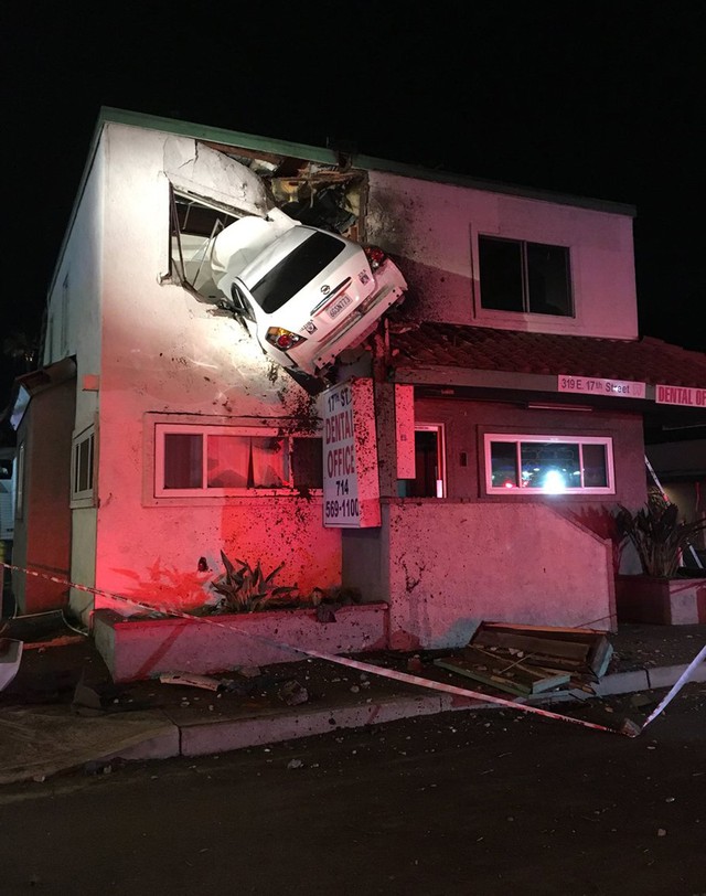 Um carro ficou "cravado" no andar superior de um prédio após "voar" durante um acidente em Santa Ana, no estado americano da Califórnia.Os bombeiros informaram que o motorista atingiu a grade central da rua e, com o impacto, o carro voou até atingir e destruir a parede de um prédio de uma clinica dentária.