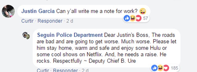 O departamento respondeu: "Caro chefe do Justin. As estradas estão ruins e vão piorar. Piorar muito. Por favor, permita que ele fique em casa, aquecido e seguro, e aproveite para ver uns programas legais. Ah, e ele precisa de um aumento. Ele é demais. Respeitosamente".