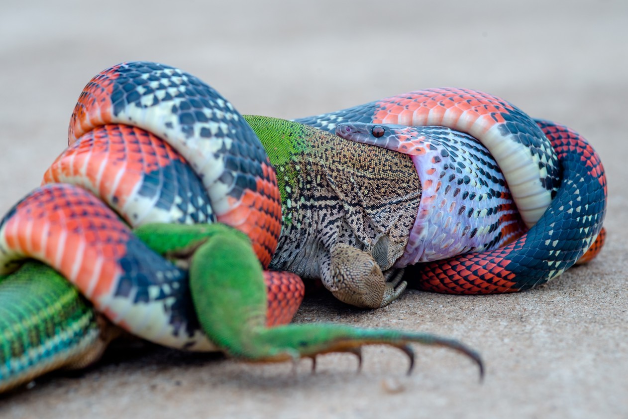 Toda a cena foi captada pelas lentes do fotógrafo especialista em imagens de natureza Júnior Esteves, que registrou desde o momento em que a cobra imobilizou o lagarto – que acabou devorado inteiro, em cerca de uma hora e 30 minutos.