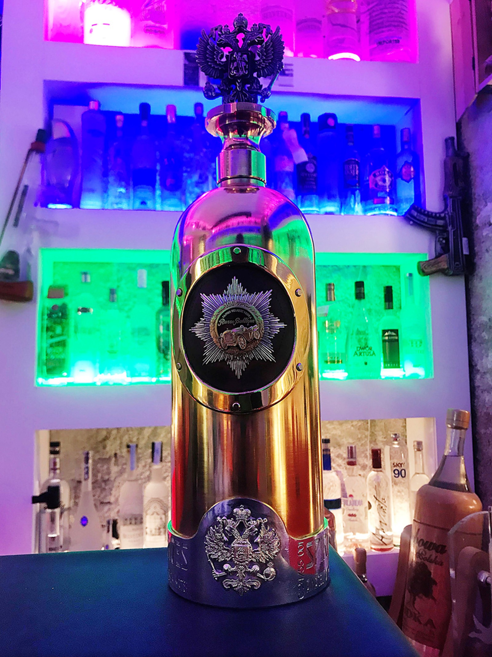 A TV2 informou que a garrafa da vodca Russo-Baltique é feita de 3 quilos de ouro e 3 quilos de prata, com tampa incrustada de diamantes.,