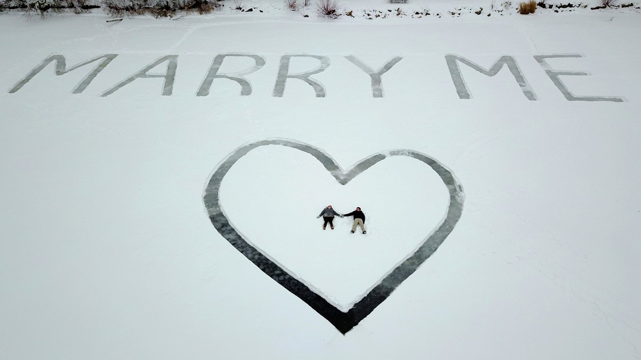 Um americano aproveitou a onda de frio que assola os EUA e desenhou em um lago congelado uma proposta de casamento para a sua namorada.Gavin Becker fez a proposta para sua namorada de longa data, Olivia Toft, no último dia 7, próximo a Nevis, no estado de Minnesota.