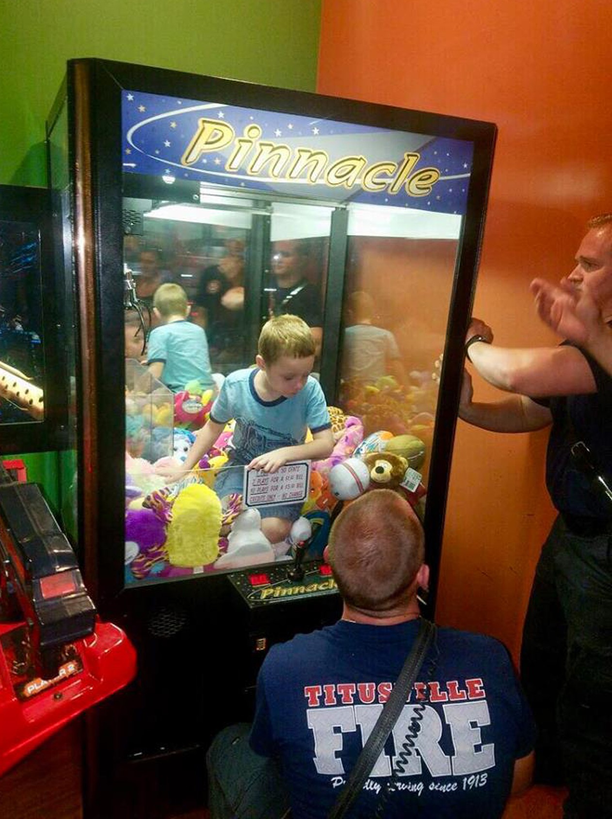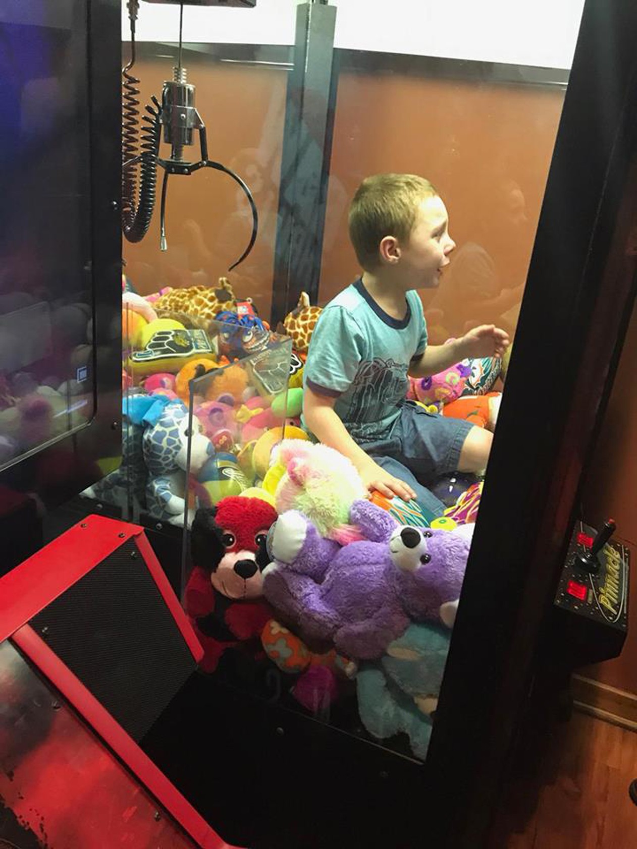 O pequeno Mason estava jantando no local e, aparentemente, decidiu que queria um bicho de pelúcia. Ele então subiu na máquina de pescar os brinquedos e, por uma abertura, entrou nela, não conseguindo mais sair.