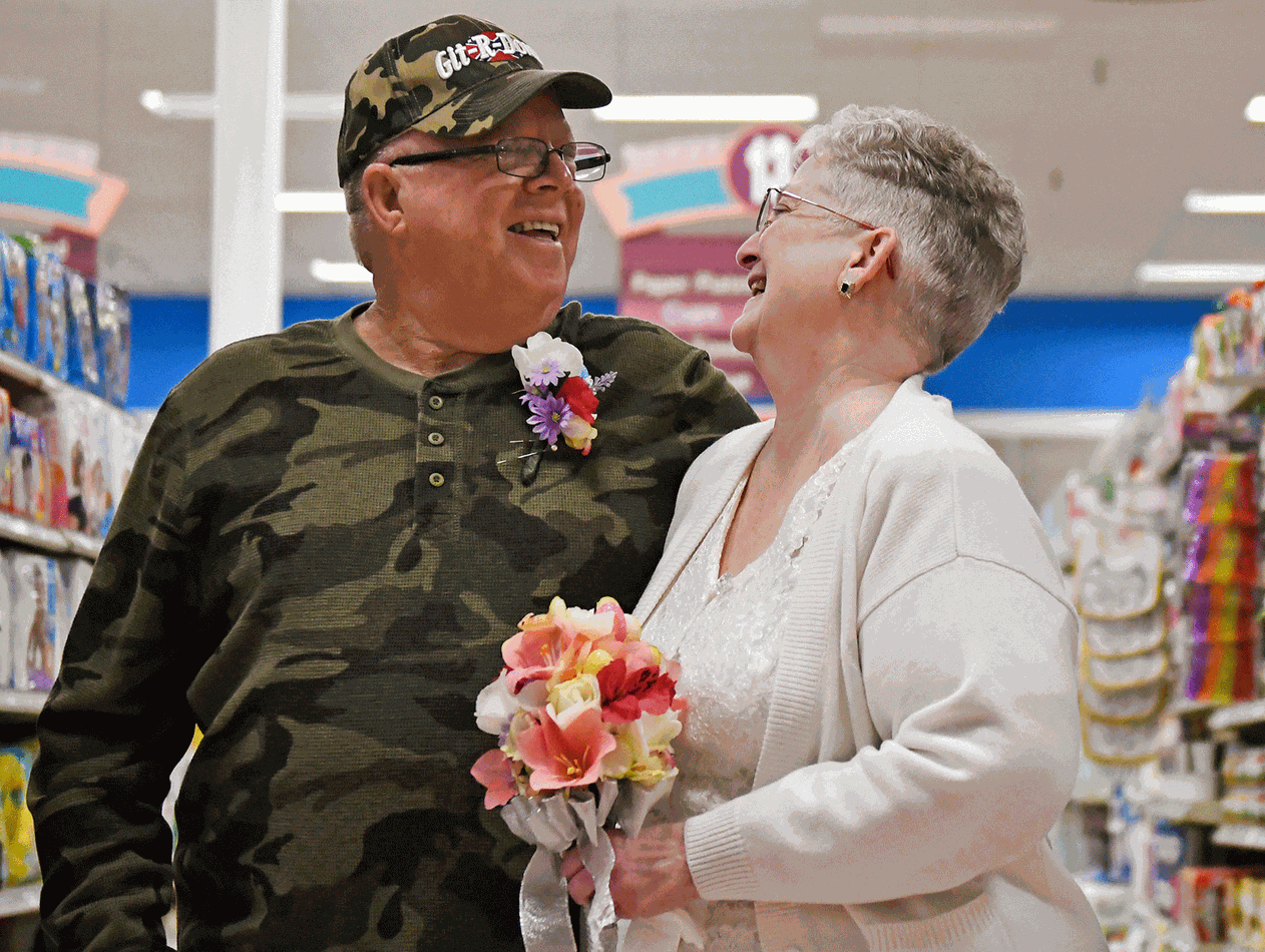 Larry Spiering, de 69 anos, e Becky Smith, de 61, casaram-se no último domingo (1) no Community Supermarket, onde eles se conheceram há 10 anos.