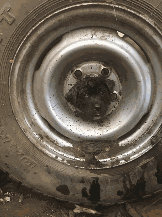 Um filhote de cachorro foi salvo pelos bombeiros após ficar com a cabeça presa numa roda de carro nos EUA.