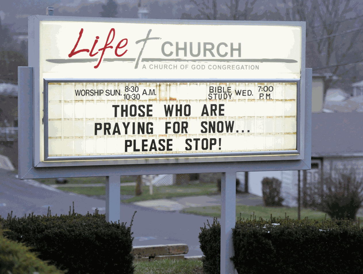 A mensagem à comunidade da Life Church, na cidade de Windber, diz o seguinte: "Aqueles que estão orando por neve... por favor, parem!".