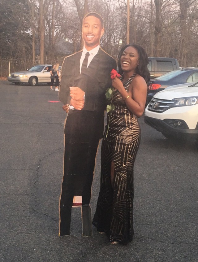 Sem par para o baile escolar, a americana Audeva Agyeman apelou para uma reprodução em tamanho natural do ator Michael B. Jordan em papelão.