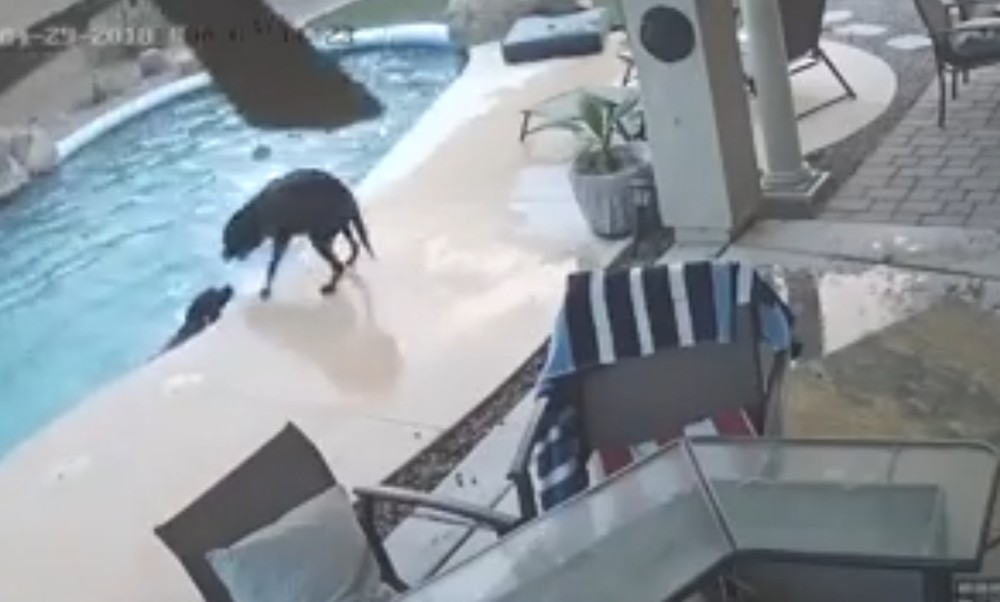 A dona dos cães e da casa, Laurie Becerra, divulgou vídeo de câmera de segurança que mostra seu cão Remus tentando ajudar Smokey a sair da piscina.