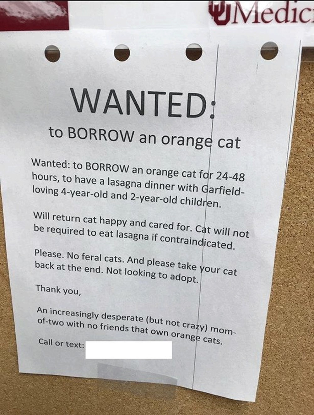 Uma mãe americana fez um anúncio pedindo emprestado um gato alaranjado para fazer o papel do personagem de quadrinhos Garfield em um "jantar de lasanha" para seus filhos, e a história viralizou.