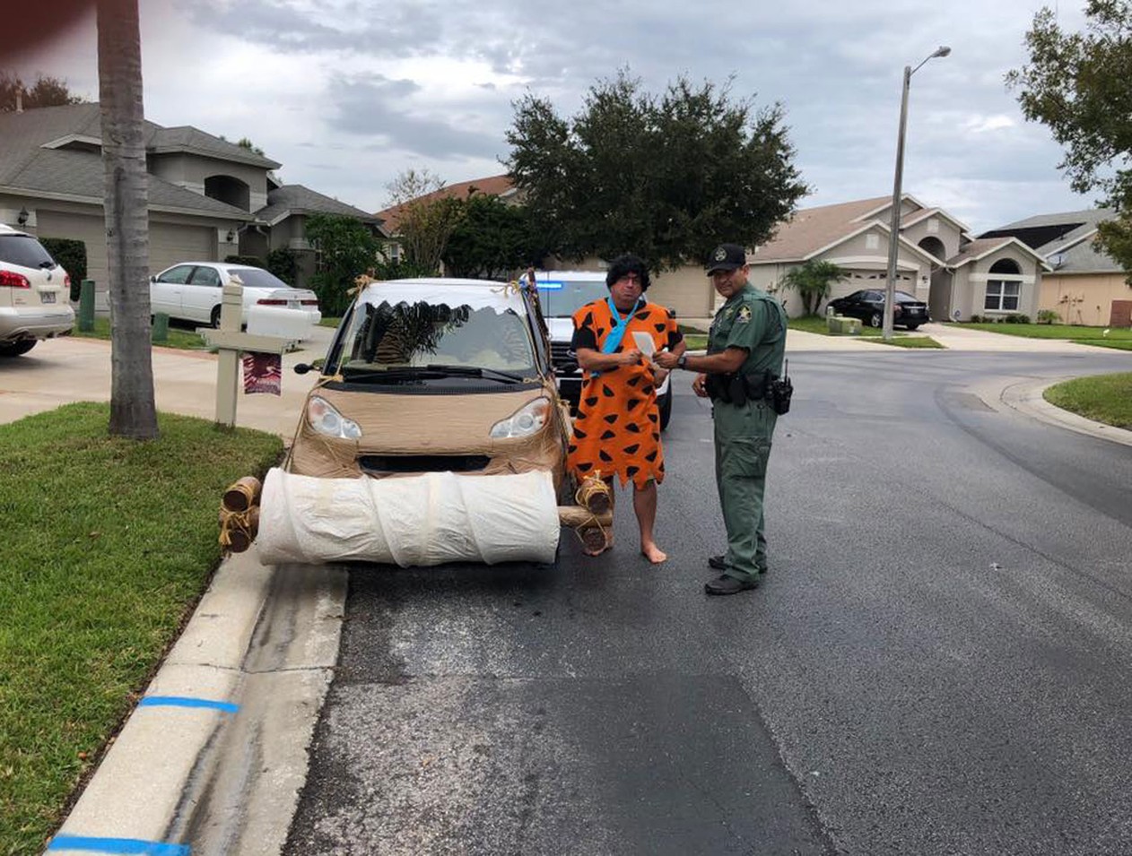 Policiais do estado americano da Flórida pararam por excesso de velocidade um motorista fantasiado que dirigia um carro parecido com o do personagem de desenhos animados Fred Flintstone.